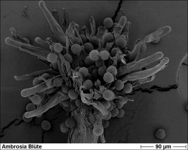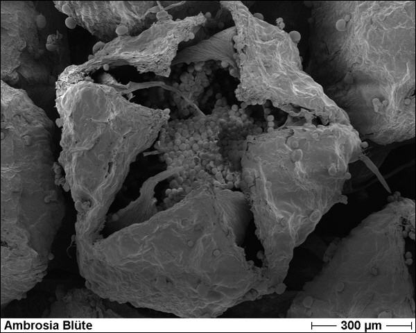 Selbst nach zwei Schnitten vermag die Beifuß-Ambrosie wieder ein drittes mal auszutreiben. Wenn auch der Austrieb nicht sehr stark ist, so bilden die nur wenige cm großen Miniatur-Pflanzen weibliche Blüten aus. Männliche Blütenstände sind hingegen kaum vorhanden. Die Mahdzeitpunkte auf dem Versuchsbeet im Botanischen Garten der Universität Frankfurt lagen im Jahr 2005 am 2.8.und 9.9. |