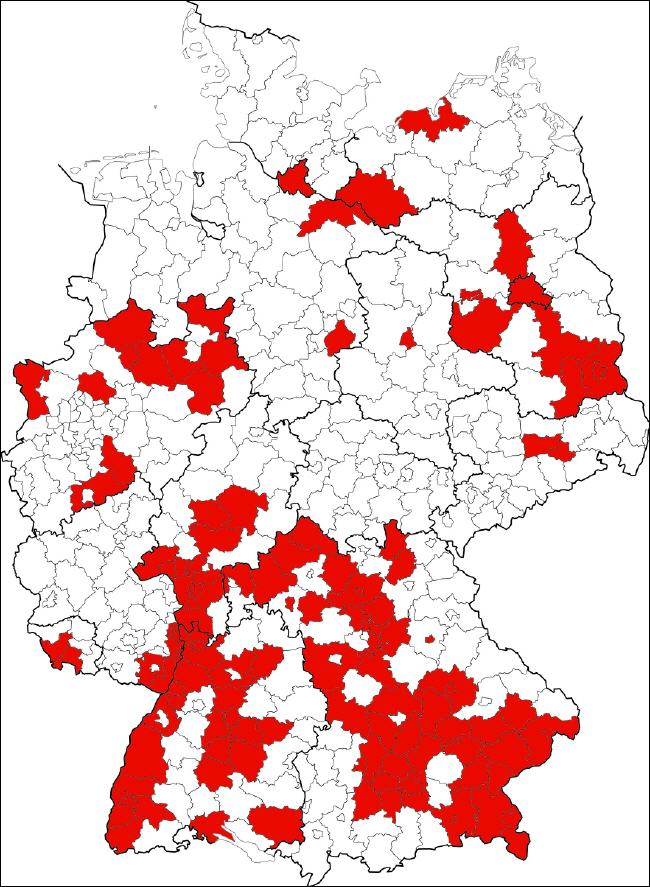 Der derzeitige Kenntnisstand zur Verbreitung und Etablierung der Beifuß-Ambrosie in Deutschland ist noch lückenhaft. Zwar liegen Verbreitungskarten auf Rasterebene mit recht zahlreichen Nachweisen vor (z.B. Bundesamt für Naturschutz 2005), doch ist deren Aussagekraft aufgrund oftmals fehlender Angaben über Bestandesgröße, Status, Expansivität und Erhebungszeitpunkt sehr eingeschränkt. Die meisten dieser Fundangaben beruhen vermutlich auf unbeständigen Vorkommen, die auf Vogelfutter zurückgehen. Die abgebildete Karte basiert auf einer Zusammenstellung großer Vorkommen ab 100 Pflanzen auf Ebene der Landkreise die auf Daten zwischen 2006 bis Anfang 2008 beruht. Die Daten umfassen neben den eigenen Erhebungen auch plausible bzw. geprüfte Meldungen verschiedener Bundesländer, jüngere Literaturangaben und Verbreitungsangaben des Julius-Kühn-Institutes. Vermutlich existiert eine Dunkelziffer bislang nicht entdeckter Vorkommen, die in ihrer Größenordnung aber nur schwer zu beziffern ist. Regionen mit mehreren großen Vorkommen der Beifuß-Ambrosie sind beispielsweise Südhessen um Darmstadt, die Region Mannheim/Ludwigshafen/Karlsruhe und Südostbayern. Die mit Abstand größten Vorkommen in Deutschland weist die Niederlausitz südlich und südwestlich von Cottbus auf. |